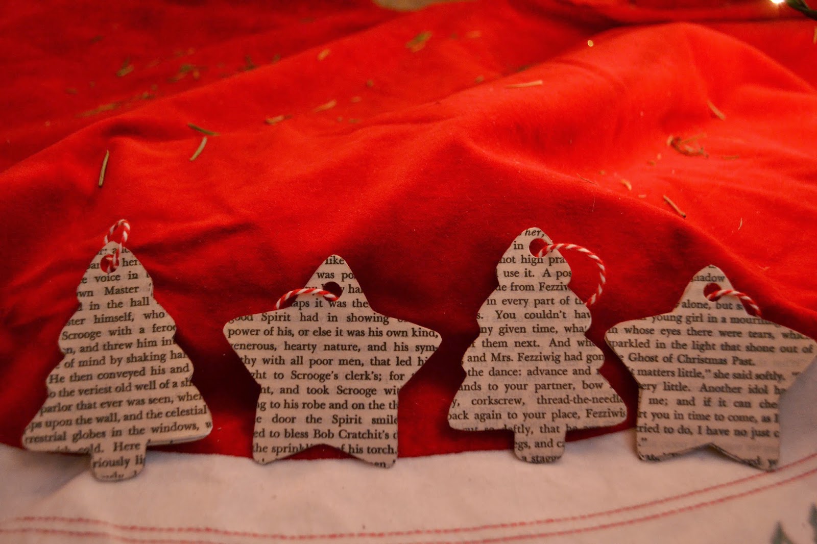 Trace the cookie cutter onto the card stock. Cut out. Trace the cut-out card stock onto two pages of the book (ripping the pages out of the book first obviously work best). Glue the shapes cut from the book pages to each side of the card stock. Cover with mod podge. Dry. (Repeat as many Mod Podge layers as you'd like. I put three layers on.) Punch a hole at the top of the ornament. Tie a loop of twine through the hole.